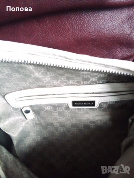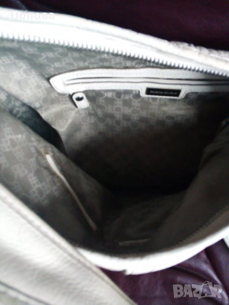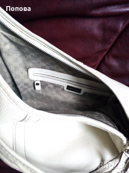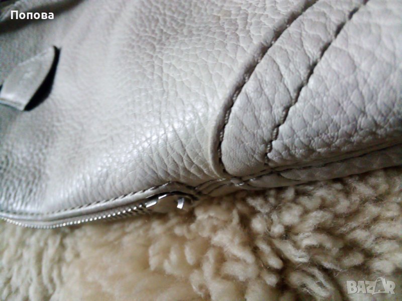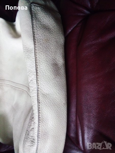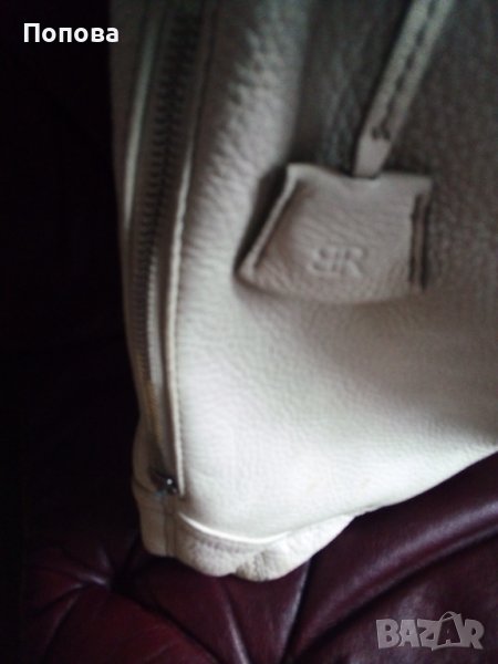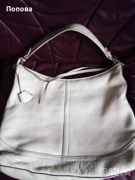 Уникална маркова чанта от висококачествена здрава естествена кожа. Купувана в чужбина. Реално цветът е слонова кост, а не бял! Забележка-горната част на държача на ципа на външния джоб се счупи, но това не му пречи да се разкопчава и да се ползва. Размери - 44 на 30 на 7 см., дръжка 48 см.. Много удобна, събира доста неща. Цената е без коментар.