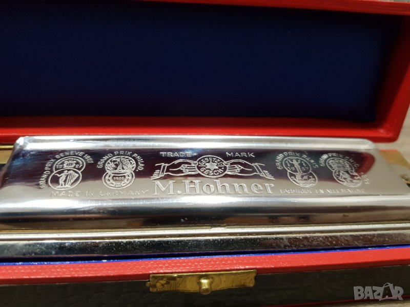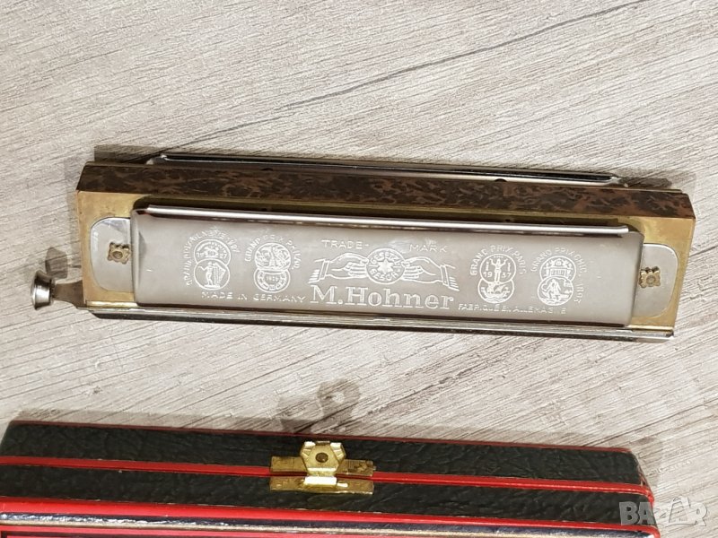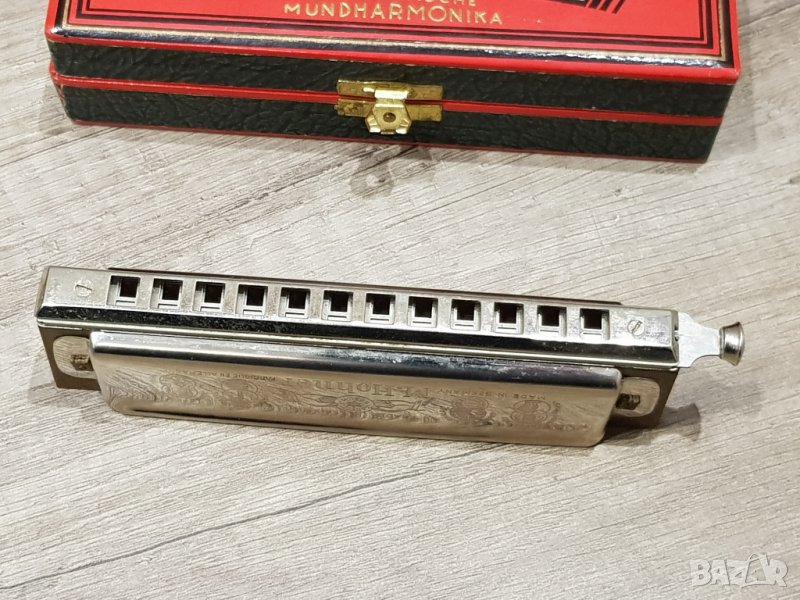 Хармониката е в много добро състояние.Тази хроматична хармоника на Hohner се състои ефективно от две арфи, настроени на полутон една от друга и разделени една от друга с плъзгач, който се управлява от бутон отстрани на инструмента.Така че, в случай на хроматична арфа, настроена на C, когато бутонът не е активиран, хармониката ще има налични ноти от скалата на C major. Обратно, когато бутонът е натиснат, са налични нотите на C# мажор, което означава, че хроматична арфа може да свири във всеки стандартен западен тон. Това е особено полезно в джаза и класическата музика, където хроматиката се използва най-много.