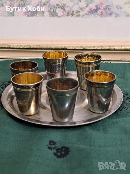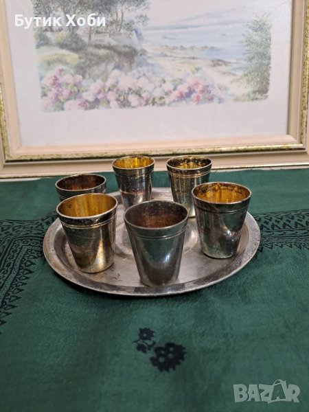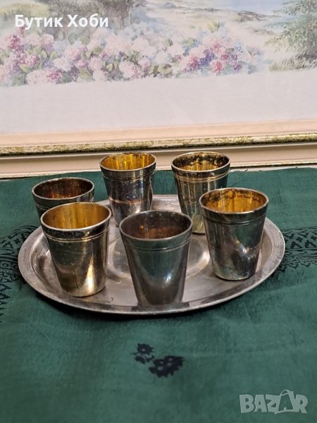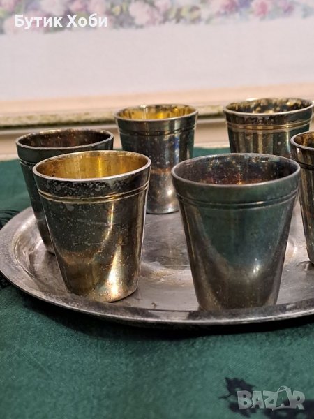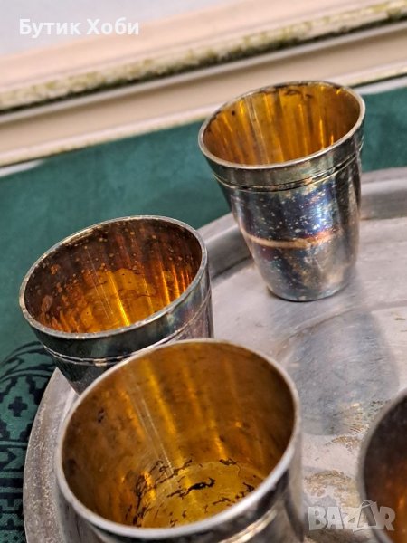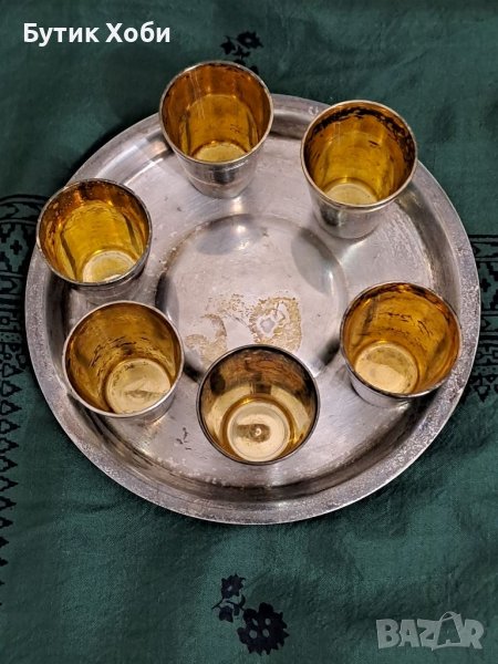 Комплект от метални шотове с поднос. Не мога да определя метала, от който е направен - плътен и е много ,,звънлив,, при удряне, с преливащи цветове по външната част и с ефект , позлата,, по вътрешната. Размери шот - 4см,диаметър - 3,5см. Поднос - диаметър - 15см. // к 11//