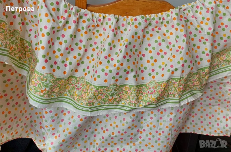 Нов, здрав и красиво щампиран плат-басма, може да се използва за завеса, весели перденца за няколко прозореца или за нещо друго - 2 х 3 метра. Дължина в набор 3 метра, общо 6 метра. Платът е на два пласта, с височина съответно 60 и 20 см. Може да се използва и като обиколник за бебешко кошче или детско легло, за каквато цел, всъщност е бил предвиден. Цена 40 лв. Изпраща се с 10% отстъпка от общоприетата куриерска такса.