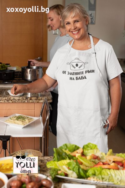 се захваща на талията с две връзки и има двоен джоб отпред.