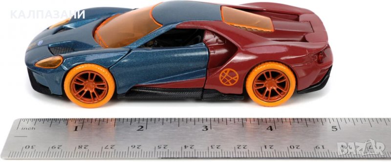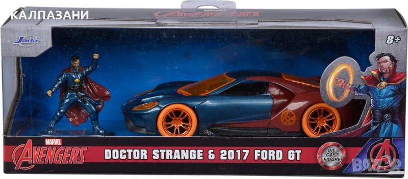 Метална количка в мащаб 1/32 на американската фирма Jada, освен точен прототип на Ford GT от филма, съдържа и фигура на Doctor Strange.