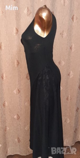 Черна еластична рокля без ръкави надолу се разширява с платки от релефни фигури,с подплата започваща от раменете . нова без хартиен носител. Под мишниците 40 до 50 см едностранно, талия 35 до 50 см едностранно, ханш 45 до 60 см едностранно, дължина 123 см.ръкавите са прозрачни с пухчета съединени на врата отпред се завързват под бюста и са подарък.
