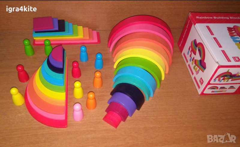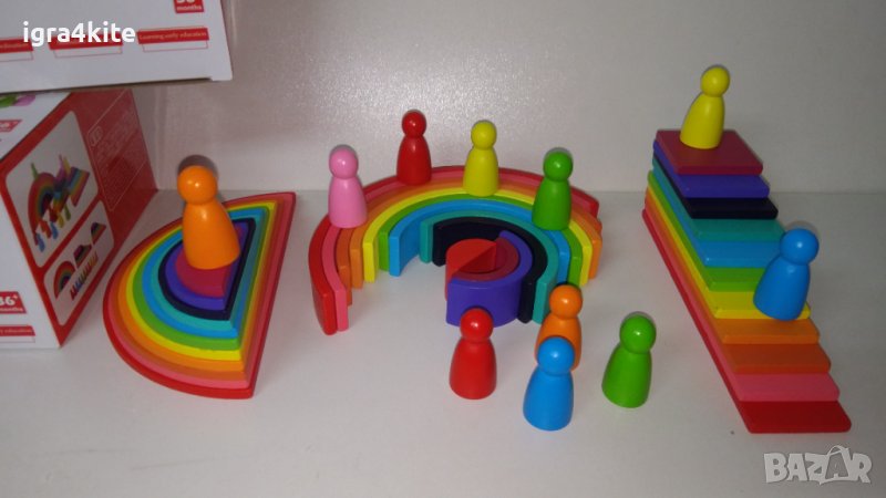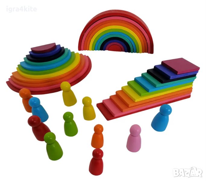 4в1 Сет дървени играчки по модел Grimms с полукръгове, правоъгълни табли, дъга и човечет