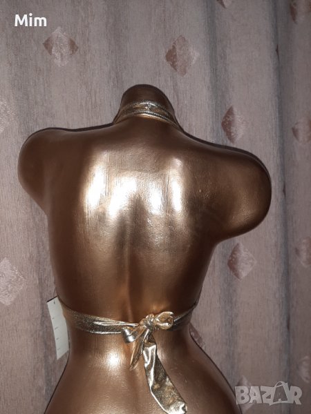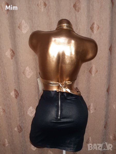 Бюстието е от златист винил завързва се отзад отпред с цип ,презрамката е през вратът. Полата е къса черна еластична имитира кожа, закопчаването е с цип отзад. Талия 43 до 53 см едностранно дължина 34 см.