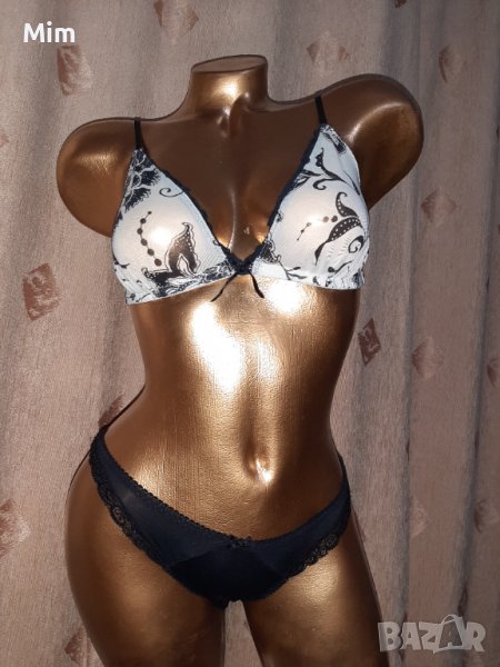 Чашката е мека от прозрачен тюл без банели, регулируеми презрамки едноредово закопчаване. Черна бикина Change тънка еластична материя с дантелка отпред. Неразличими от нови без хартиен етикет.