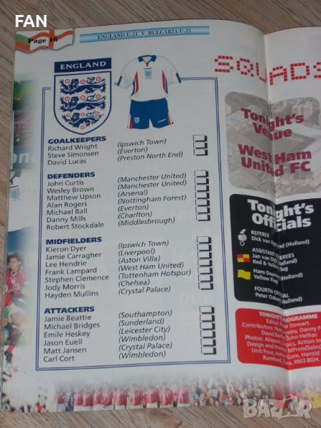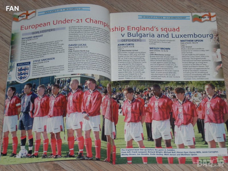 Предлагам оригинална футболна програма от мачът между отборите до 21 г. на Англия и България - квалификация за Европейското първенство до 21 г. в Словакия през 2000 г.