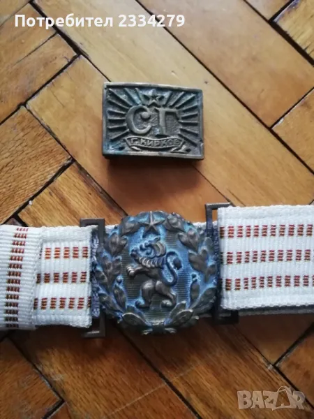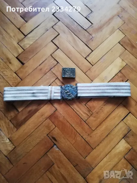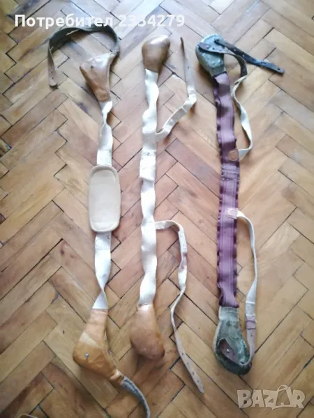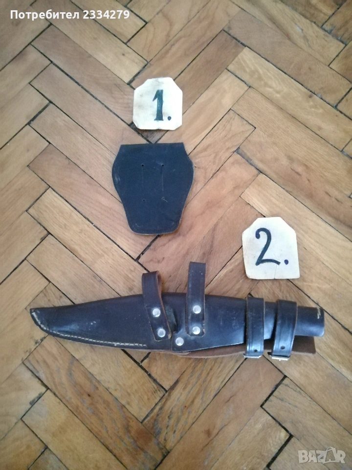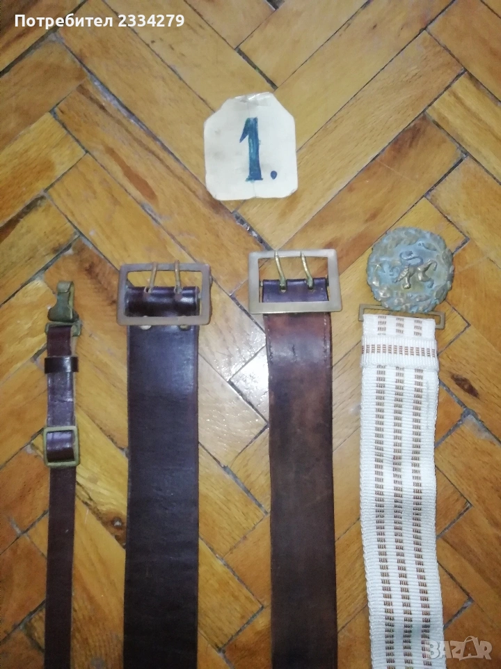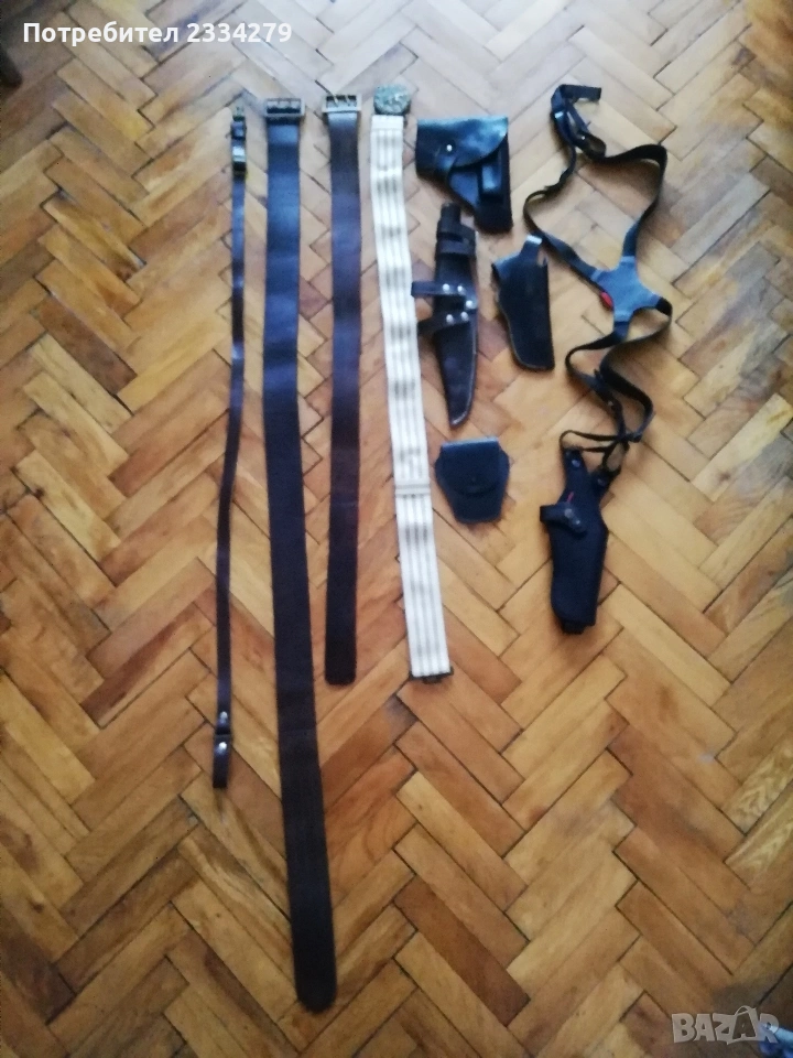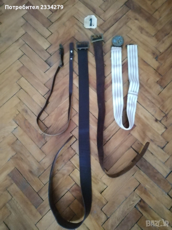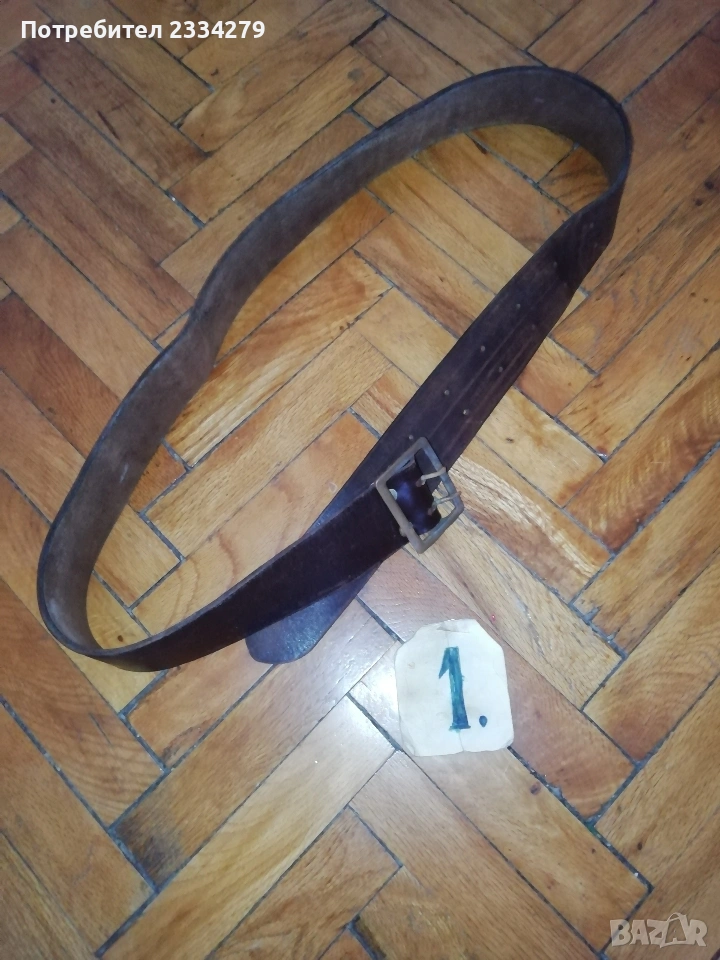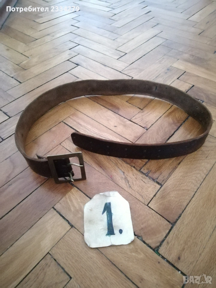N:1 неизползван кожен калъф-кобур от естествена кожа за белезници, размер 13х11см., цена 8€.; N:2 калъф за военна малка кирка-шансов инструмент закачаща се към колан, изработена от телешка кожа,размер 35х8см., цена 15€.; ОТ ЛЯВО НА ДЯСНО: N1 военна през рамка,,портупей" за военен командирски колан, естеставена кожа бронзови закопчалки, цена 6€; N:2 военен офицерски колан, вероятно от царство България и началото след 44година, двойно закопчаването, бронзова тока, кафява естествена кожа в много добро състояние, няма начепено, бронзова тока, размер 1м.35смХ 5см.цена 20€.; N:3 стар военен колан, естествена кожа с бронзова тока двойна, размери 98х5см., цена 10€.; N:4 стар параден еластичен колан от Соца, БНА,НРБ, цена 13€.; N:5 кадетски училищен от 50-те, бронзова тока с инициали и емблема на гимназията, цена 5€.; N:7 медицински военни тиранти, колани, атрибути използвани през войната за ранени войници, цена 3€. за бройка.