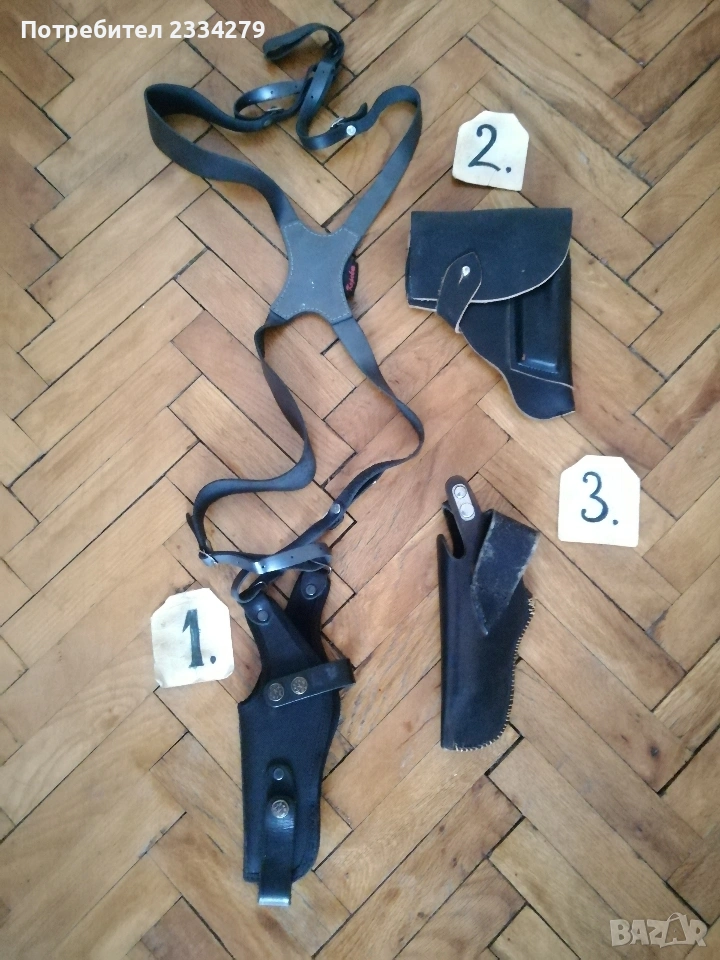Макаров, WALTER, P38/АР ", перфектно състояние, размери 20х15см.,цена 20€.; N:3 стар ръчно изработен от естествена-телешка кожа, закачащсе на олан, размери 20х9см., цена 13€. Кобур, изработен ръчно от телешка кожа,закачащ се за колан, цена 10€.;