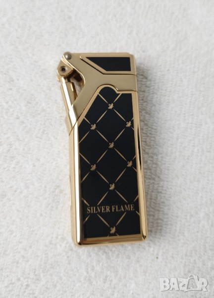 Продавам луксозна запалка със златиста украса върху фино черно покритие с надпис „Silver Flame“.