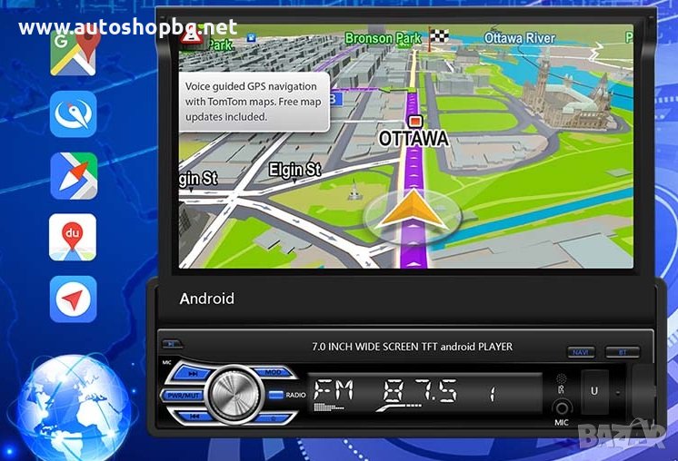 Екран: HD 7 инча сензорен (тъчскиин) екран с разделителната способност 800 x 480. Наслаждавайте се на филмите и навигацията. Може да свържете и слушалки с Bluetooth; Функция GPS навигация: може да използвате Google maps, или със SD карта, която съдържа картата;