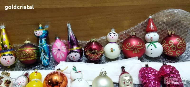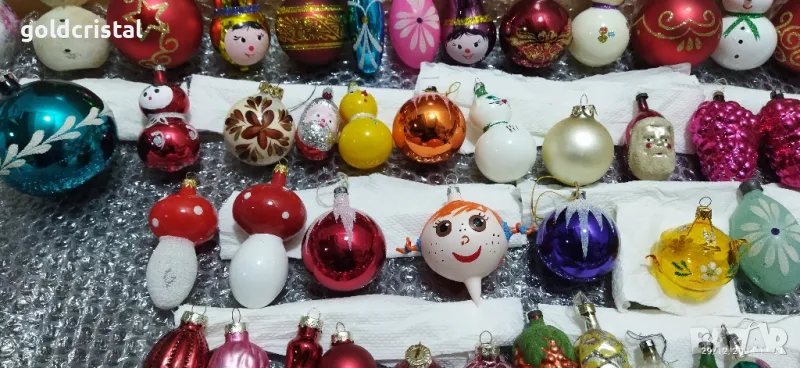 Стъклени играчки за елха снежен човек 49лв пипи-49лв чайник 39лв глава дядо мраз 29лв принцеса, снежанка, голяма Гъбка -29лв за брой пате гъбка коте палячо матрьошка 25лв за брой лимони розов и син 15лв за брой големи топки 20лв средни 15лв малки 10лв шишарки 15лв за брой най-малки най долен ред 4-5лв за бр сервиз комплект сет лот ретро арт декор винтидж колекция стари антикварни предмети обзавеждане за дома и семейството Коледа Нова година Бъдни вечер коледна елха новогодишни празници