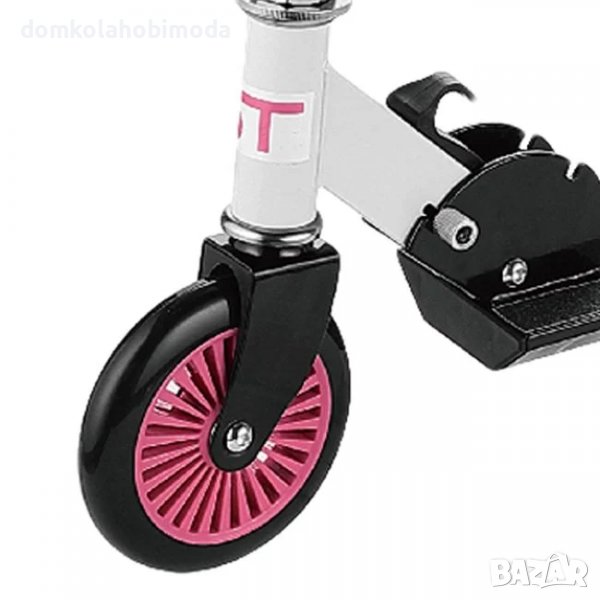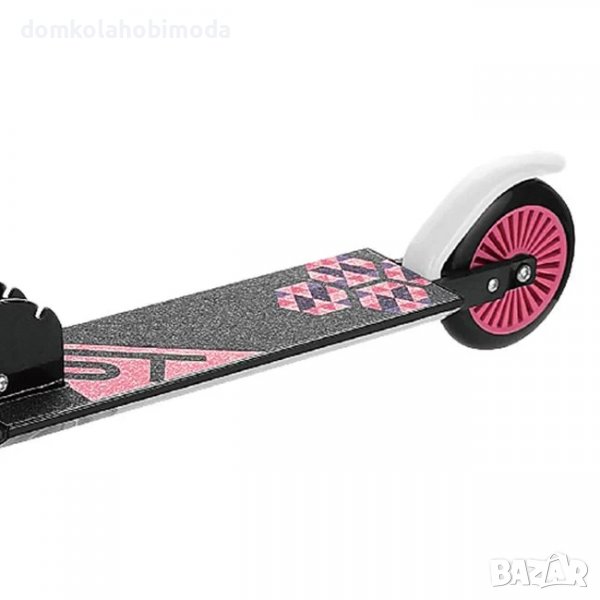 Сгъваема алуминиева кънка Розово Черна Описание - Характеристики Сгъваема кънка с регулируема височина на кормилото от 70 до 80 см. Има 2 PU колела с висок отскок, лагери ABEC-7, меки дръжки и спирачка на задното колело. Минимално тегло на потребителя: 35 кг. Дължина на основата 28 см