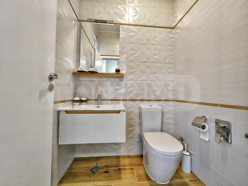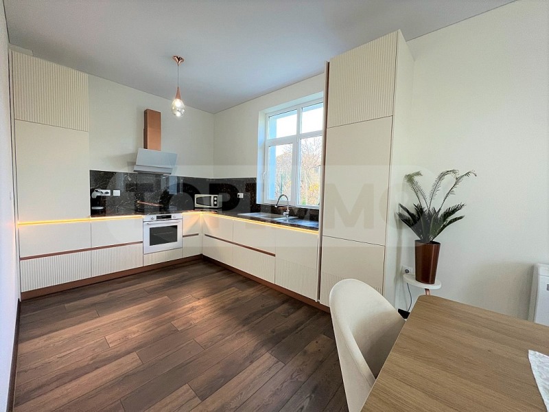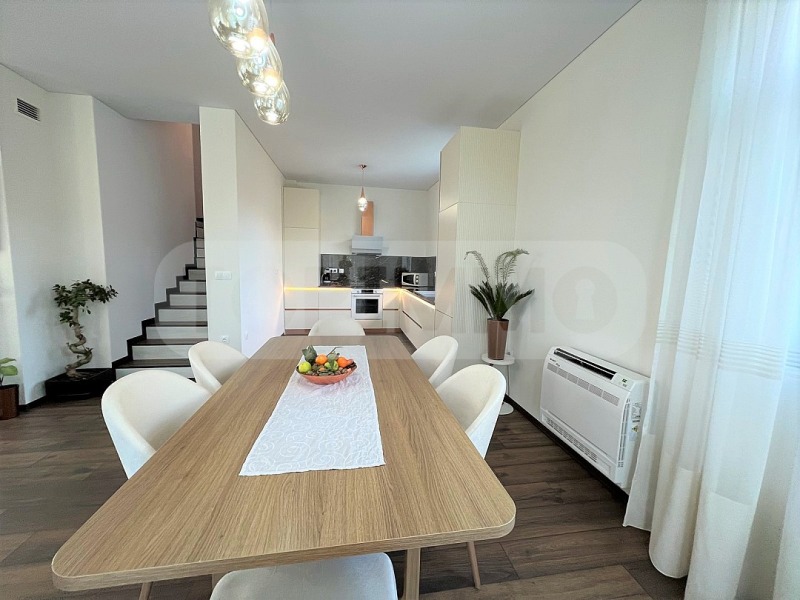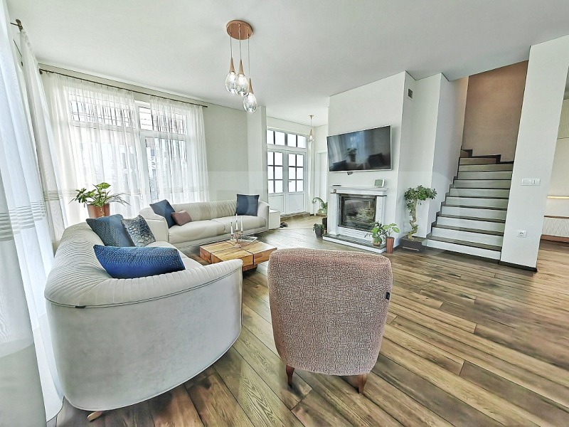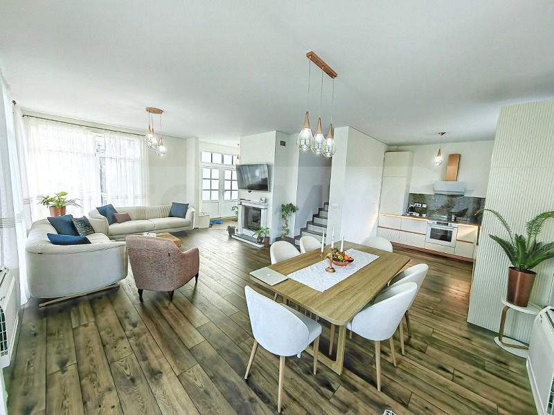 Първи етаж се състои от просторна и светла дневна с височина на тавана от 3 м, френска камина с въздуховоди, модерна кухня и трапезария, тоалетна, гардеробно помещение.