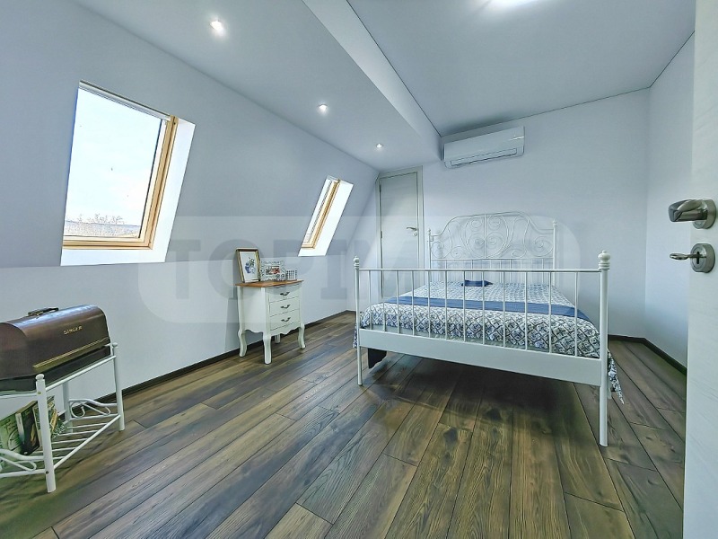 Удобно вътрешно стълбище отвежда към втори етаж с две спални, едната от които със собствена гардеробна, две бани и тоалетни, външна панорамна тераса, перално/гардеробно помещение.