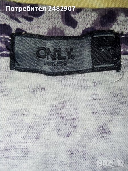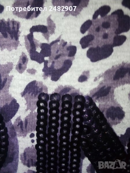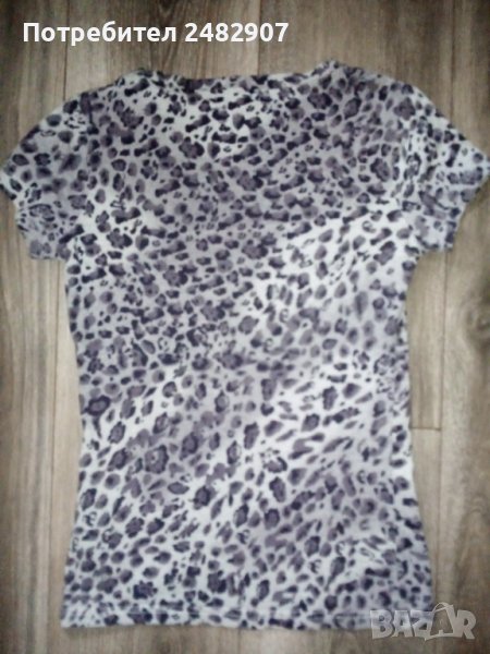 Дамска блуза с къс ръкав, тигров принт и пайети, размер XS. Ширина в раменете - 34 см, ширина под мишниците - 39 см, дължина от рамото до долу - 56 см, дължина на ръкава от рамото - 12 см. Много запазена, почти не е използвана.