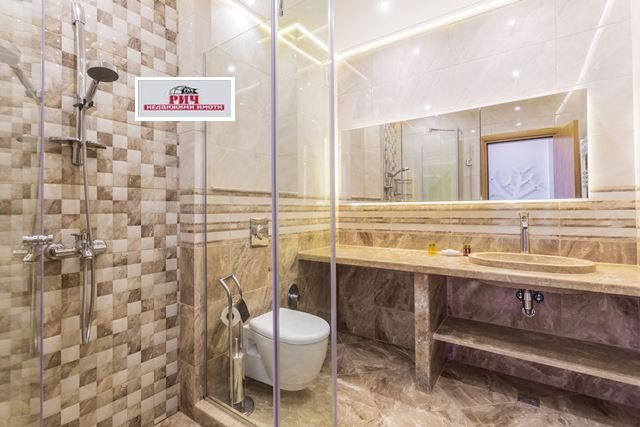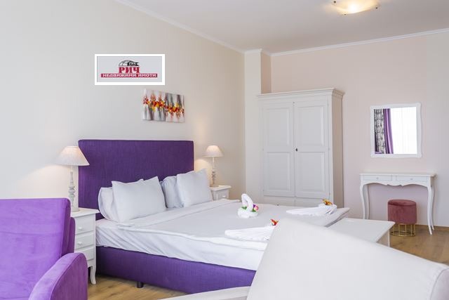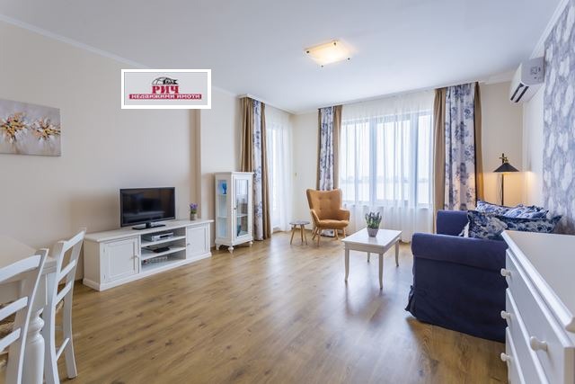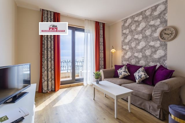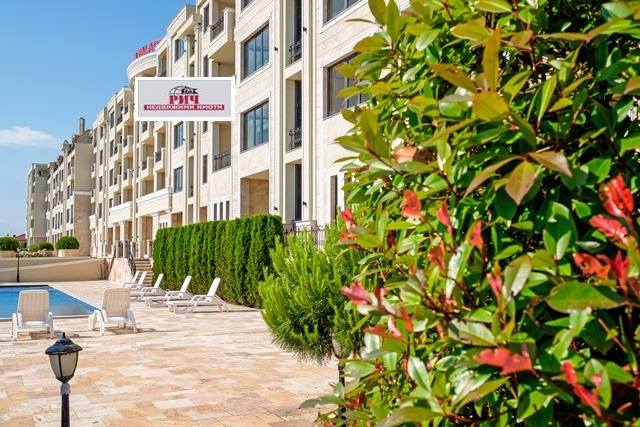 Апартамент Е6. Втори етаж. Гледка море. Намира се в луксозен действащ комплекс с впечатляваща архитектура и местоположение на първа линия море и езеро. На разположение на собствениците са голям обществен плаж, два външни басеина, впечатляваща градина, открит паркинг, подземен паркинг с директна връзка с апартаментите, ресторант с външна морса тераса, СПА център с парна баня, закрит басеин, масажни студиа, хидромасажни вани и фитнес център с гледка към морето. Апартаментите са разположени в девет пететажни корпуса: едноспални с по 1 тераса и изглед към морето от 85 кв.м. до 126 кв.м., и с две тераси с изглед към море и към езеро от 110 кв.м. до 131 кв.м.; двуспални апартаменти с изглед към море и към езеро от 120 кв.м. до 173 кв.м. и три спални апартаменти с изглед море и езеро от 149 кв.м. до 205 кв.м. Индивидуална мултисплит система GREE . Към всеки апартамент има складово помещение. Възможност за избор на дву-три спален апартамент с един или два санитарни възела. Стилно и конфортно обзаведени са 59 апартамента. Цени: от 2000Е/кв.м. Обзавеждането се закупува отделно. За закупуване се предлагат и единични и двойни/едно зад друго/ подземни паркоместа по 30000-45000Е. Годишна такса за поддръжка/стълбищни клетки, външни басеини и градината/ и охрана с вкл. ДДС: едноспален апартамент- 2040 лв, двуспален апартамент - 2640лв, триспален апартамент - 3240лв. За повече информация, моля, свържете се с нас! За връзка използвайте нашата ел. поща: