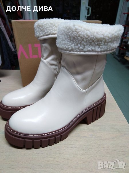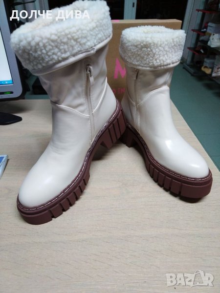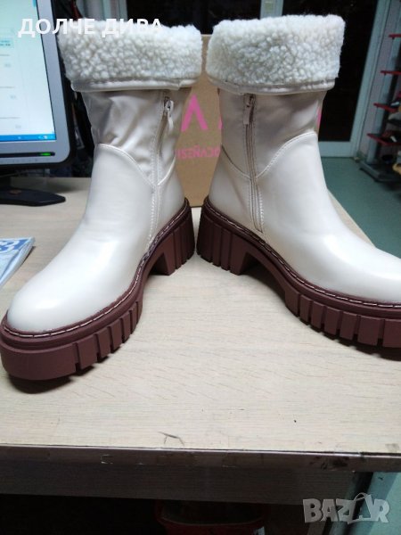Дамски боти от качествена светло бежава еко кожа с топъл хастар и топла стелка на удобно зимно ходило с грайфери. Височина на платформата отпред 3,5см. и височина ток 6,5см. За доп. Информация-пишете или позвънете! НАМАЛЕНИЕ от 69лв. на 49лв. !!!