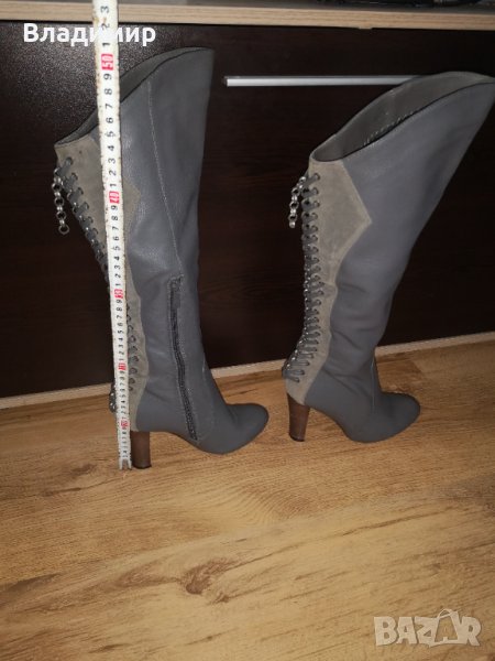 Продавам сиви дамски ботуши с ток, тип чизми. Номерът е 36. Слагани са само няколко пъти, като нови, видно от подметка та на снимките!