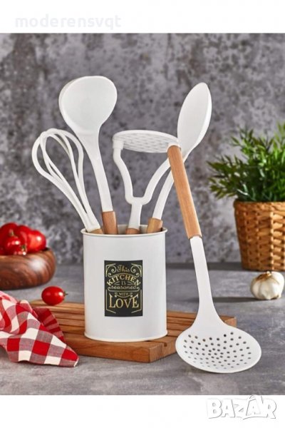 Комплект прибори за готвене от 6 части. Комплектът включва 5 прибора плюс поставка. Изработени са от пластмаса.