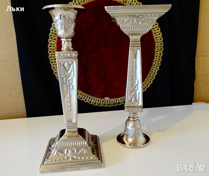 масивна мед,дебело посребрен с висока проба сребро.Декориран с релефна глава на Овен и барокови орнаменти.Височина 24.5 см.,диагонал на основата 14 см.,тегло на всеки 590 гр.Налични 2 броя,цена 69 лв.,за брой.