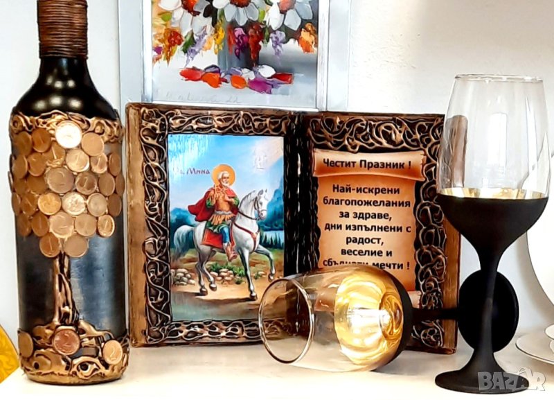 Комплект книга със Св. Николай, Богородица или Св. Мина с универсално, празнично пожелание и Бутилка