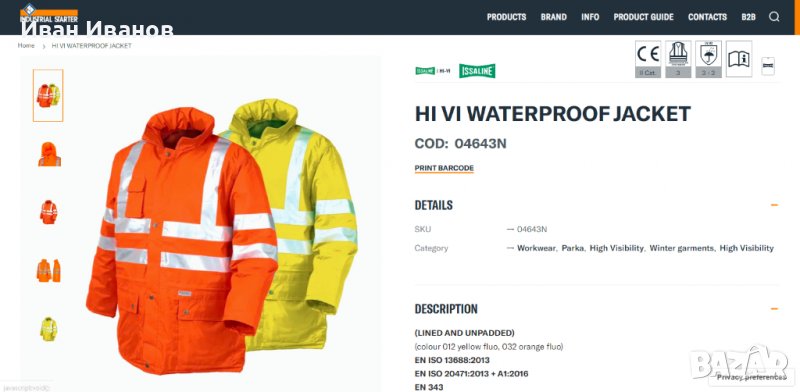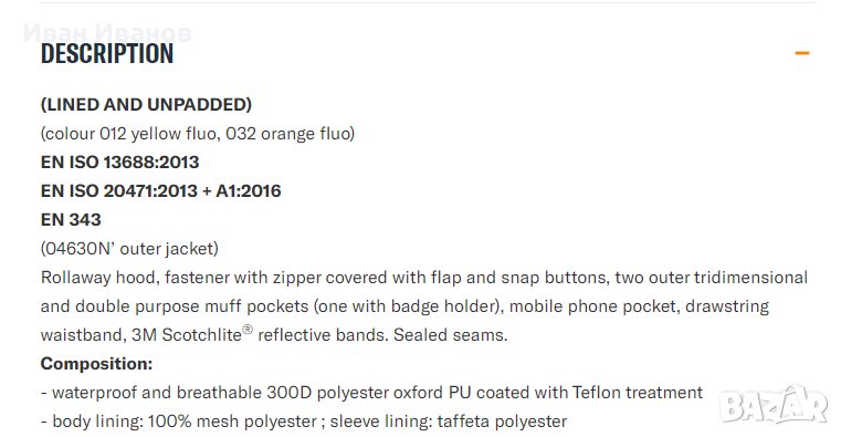 Fluo Parka от Industrial Starter, напълно водоустойчиво яке против студ с 4 външни джоба и един вътрешен, един телефон, флуоресцентна материя с 5 см светлоотразителни ленти. Сваляща се подплатена качулка. Полиестерна смес, покрита с PVC по шевовете, полиестерна подплата