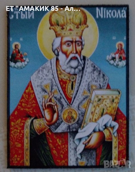 Иконите са с размери 8 см височина 6 см ширина и 2 мм дебелина. Видовете икони които предлагам са: Св. Троица, Иисус Христос, Св Йоан Кръстител, Св. Св. Петър и Павел, Св. Атанасий Велики, Св. Антоний Велики, Св. Василий Велики, Св. Николай Чудотворец, Св. Мина, Св. Димитър Солунски, Св. Георги Победоносец, Св. пророк Илия, Св. Йоан Рилски, Св. Петка и Св. Св. Вяра Надежда и Любов.