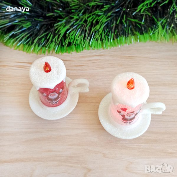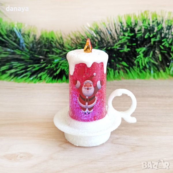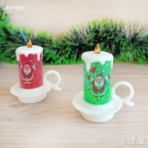 Малка електронна коледна свещ с височина 8см. Свещта свети в преливащи цветни светлини. Фигурите се предлагат в три цвята – червен, зелен или бял цвят, като всяка от свещичките си има декорация Снежко или Дядо Коледа по тялото. Работи с 3 АG13 батерии, които са включени в комплекта.