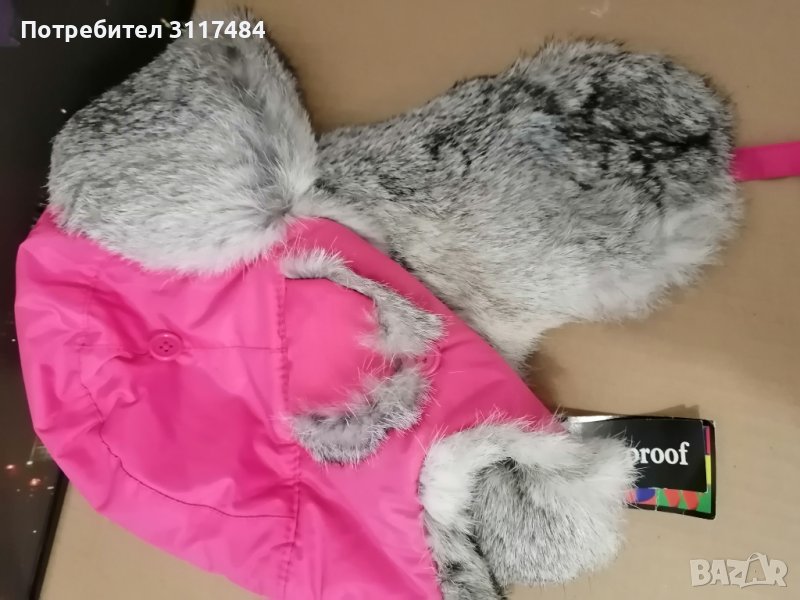 Уникална шапка ушанка със заешка кожа естетвен косъм и непромокаема материя в светъл лилав цвят и наситено цикламено