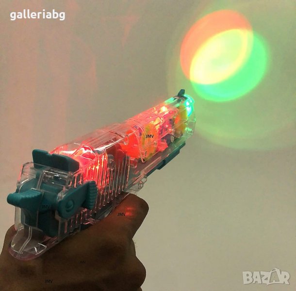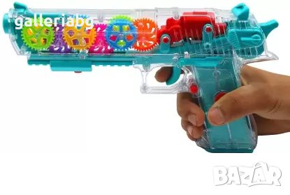 Играчка пистолет с прозрачен дизайн, който позволява да се виждат цветните движещи се зъбни колела отвътре. При натискане издава забавни звуци и свети с ярки LED светлини. Чудесен избор за забавление и игра.