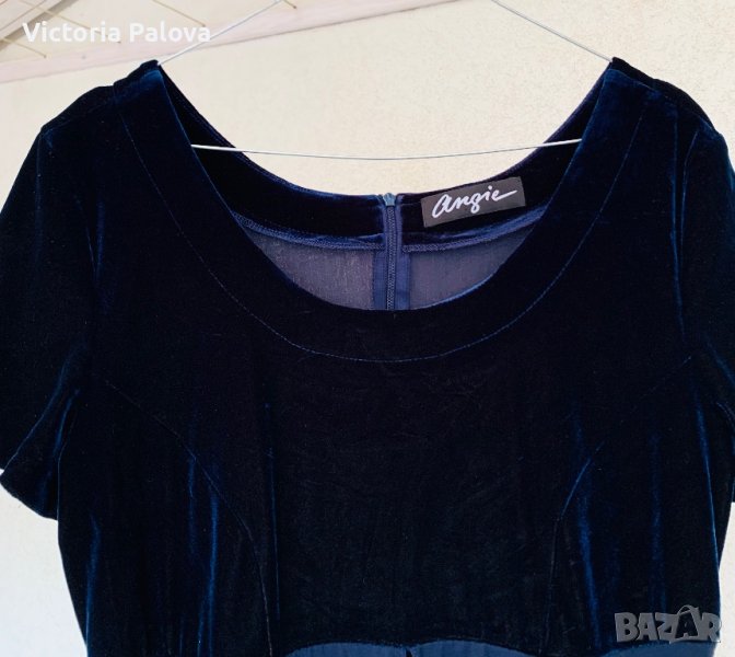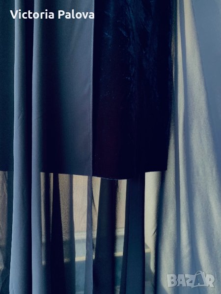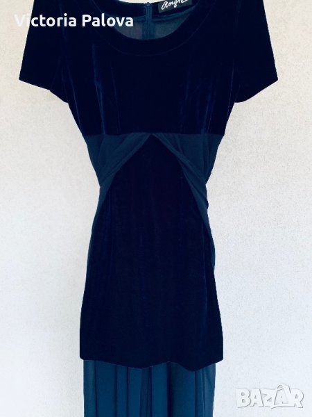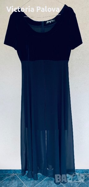 Прекрасна рокля от две части,подходяща за партита и особени случаи:късата рокля от тъмно-синьо кадифе(разтегливо),другата част е дълга,от феерична материя,която се отваря леко при вървенето.много интересен необичаен модел,стои прекрасно,защото кадифето се разтяга,отзад е с цип.рамо-44-46см,ГО-48см,късата рокля-81-82см,дългата-132см.