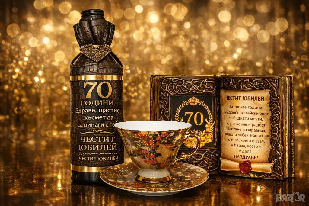 Може да добавите и декорирана с кожа във формата на торбичка бутилка с дървена плочка пожелание и съответните на повода, златни цифри.