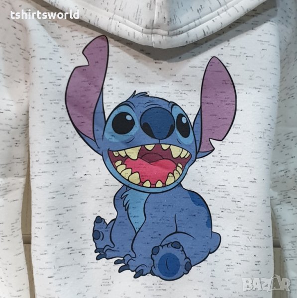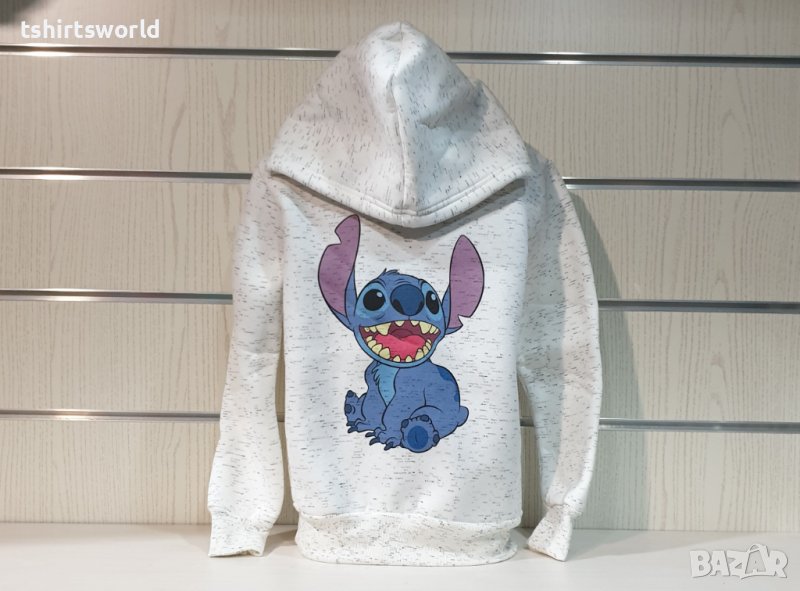 Страхотен нов детски суичър в цвят бял меланж с качулка и дигитален печат на героя Стич от Lilo and Stitch. Произведен в България под марката PRINTEX от 100% висококачествен памук, което го прави изключително топъл и желан от нашите дългогодишни клиенти. Моделът е подходящ за пролетния и есенно-зимният сезон, има ластични маншети на китките и ханша, запазващи топлината. Меката подплата и свободната кройка го прави изключително удобен за нашите малки клиенти.