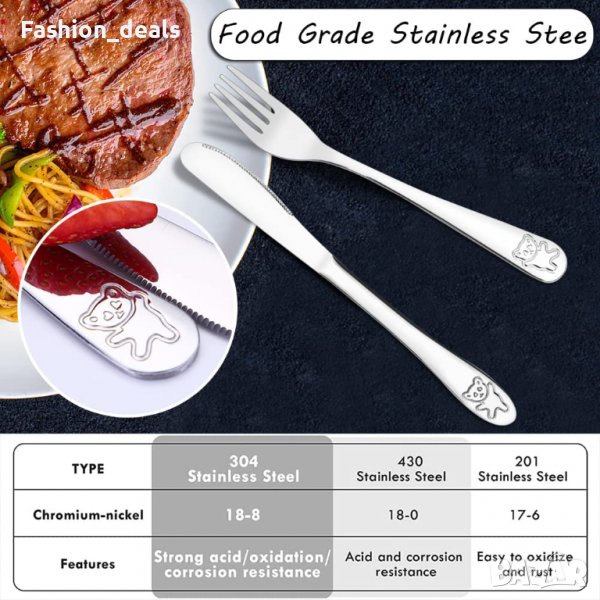 Нов Детски комплект прибори за хранене 4 части Деца 3+ години Лъжица Нож Вилица неръждаема стомана
