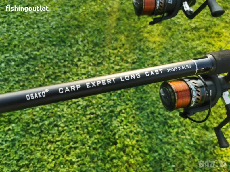 Чисто нов комплект от три шарански въдици от доказния в риболовните среди бранд - Оsako в комплект с три шарански макари и здраво монофилно влакно към тях с дебелина 0.30мм