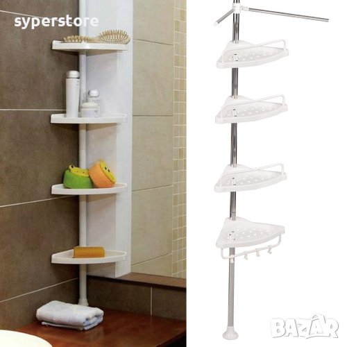 ГОЛЯМО СЪХРАНЕНИЕ - Дренажните отвори в рафтовете предпазват излишната вода от натрупване, намалявайки натрупването на мухъл. Телескопична тръба с 4 регулируеми рафта може да се постави на всякаква височина и предлага достатъчно място за съхранение на артикули за баня.