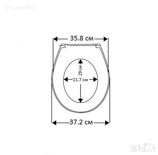 Външните размери на WC седалката са 37.2 / 35.8 / 4 см, а витрешните са 21.7 / 29 см.