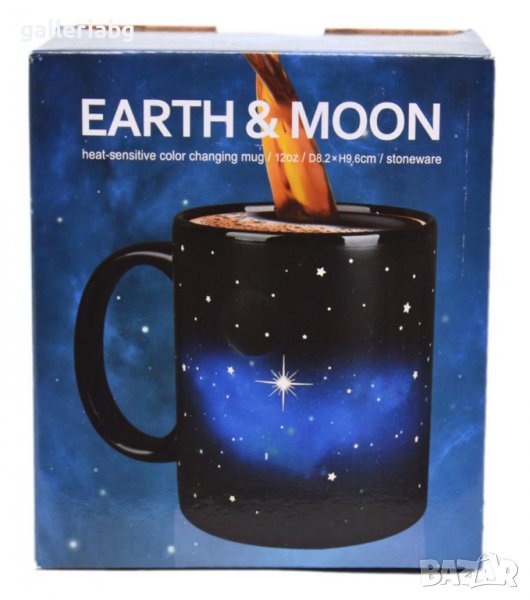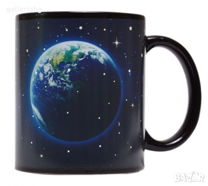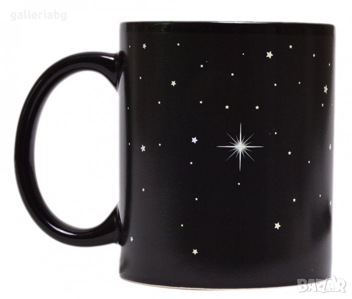 Магическа порцеланова черна чаша с декорация звезди. След като се налее топла течност се "появява" планетата Земя.