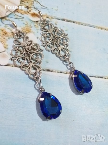 💎💎💎Прекрасен комплект бижута дълги обеци и колие във Викториански стил с красиви кралско сини акрилни капки и орнаментирана основа в цвят сребро 💎💎💎