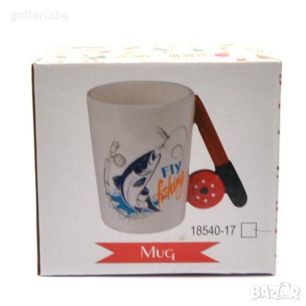 Забавна керамична чаша. Чашата е с надпис Fly fishing и дръжка във формата на въдица.