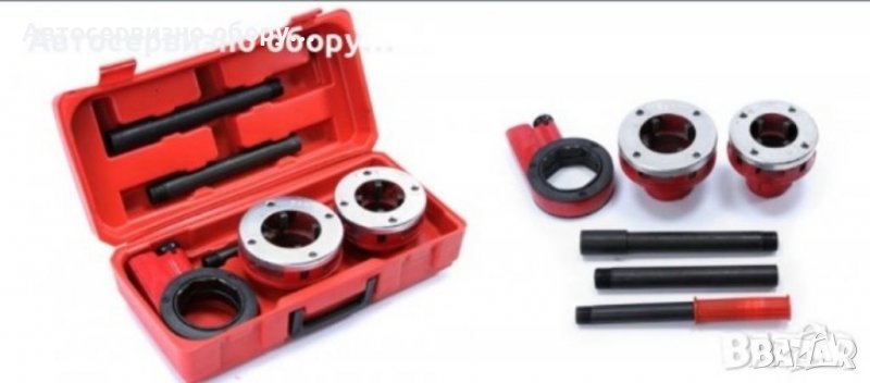 Ръчно устройство за навиване на тръби + комплект от 2 матрици в кутия, ви позволява да създавате издръжливи резбови връзки. Работи добре при хидравлични работи, както и в дърводелски работилници.