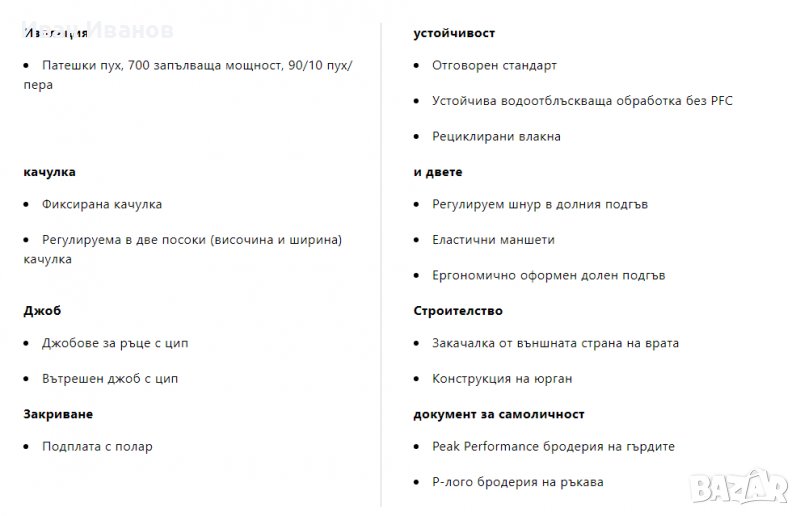 Peak Performance впечатлява със своите затоплящи свойства и поддържа правилната температура на тялото дори когато е под нулата. За да се предотврати проникването на неприятности като вятър и влага във вътрешността на якето, якето е оборудвано с ветроустойчиви и водоотблъскващи материали. Областта на главата също е защитена от времето с качулка. Тя може бързо и лесно да се регулира според формата на главата с шнур и винаги стои идеално.