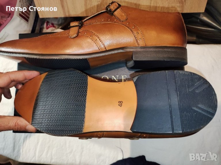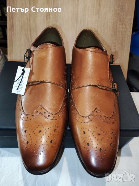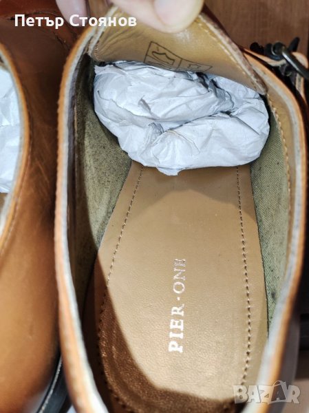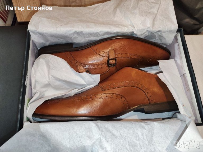 Предлагам чудесни мъжки официални обувки на марката PIER ONE Обувките са чисто нови, в кутия, купувани са на разпродажба за 49 евро. Произведени са в Индия от кафява естествена кожа, хастарът и стелката са комбинация от текстил и естествена кожа, подметката е от полиуретан. Нямат връзки, а са с по две катарами в предната част. Дължината на стелката е почти 32 сантиметра, защото са с издължен напред връх а височината на тока е 2.5 см. Изпращам с избран от купувача куриер.