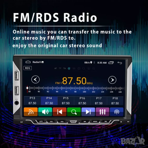 9. FM радио: Онлайн музика можете да прехвърляте музиката чрез FM, за да се насладите на оригиналния стерео звук в колата, с 18 предварително зададени станции