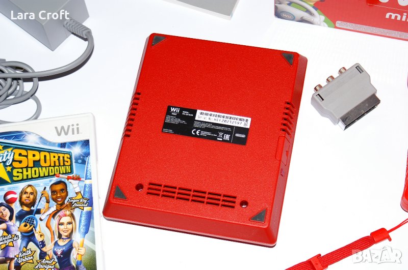 Комплекта съдържа Ннинтендо Wii Мини, кутия, книжки, контролер+силиконово протекторче, нънчък, сензор бар, захранване, кабел за връзка с телевизора + скарт преходник и една игра подарък Celebrity Sports Showdown.