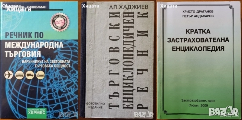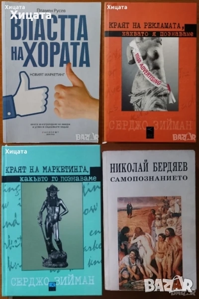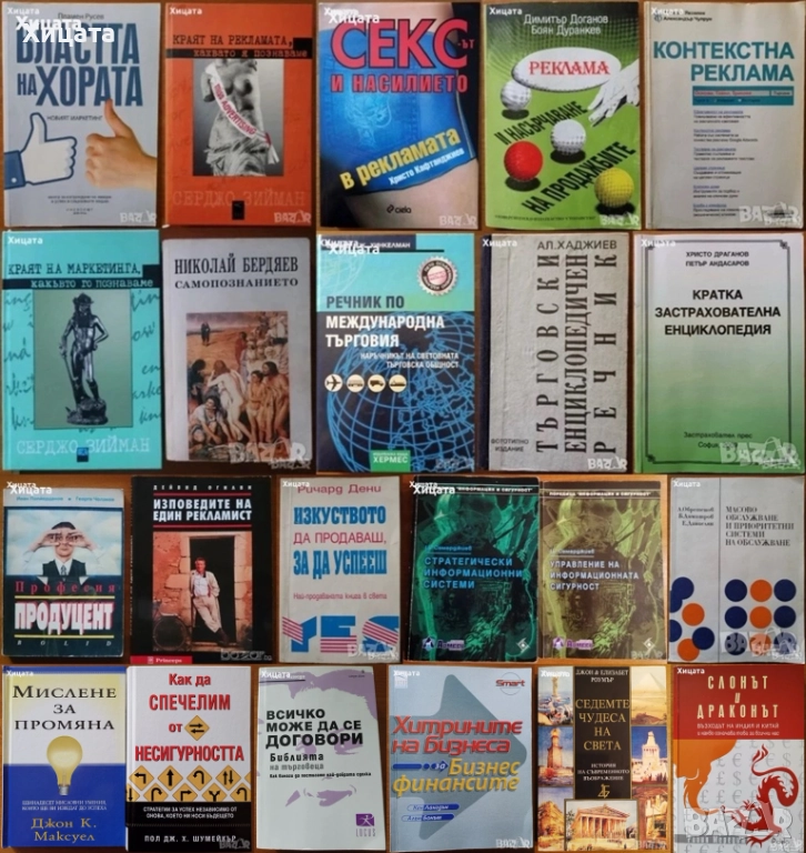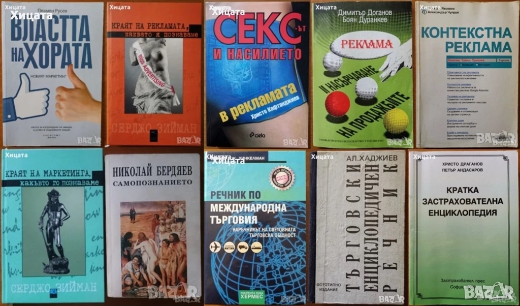 Професия продуцент.Сборник с материали за продуцентството в киното и другите масмедии,Иван Попйорданов,Георги Чолаков,Болид,1993г.232стр. - 50лв. Изповедите на един рекламист,Дейвид Огилви,Принцепс,1999г.154стр. - 60лв. Изкуството да продаваш,за да успееш.Изпитани техники за сключване на сделки и продажби,Ричард Дени,Весела Люцканова,1997г.192стр. - 50лв Сексът и насилието в рекламата,Христо Кафтанджиев,Сиела,2006г.488стр.Нова! - 45лв. Реклама и насърчаване на продажбите,Димитър ,Боян Дуранкев,УИ "Стопанство",1995г.208стр. - 30лв Контекстна реклама - основи,тайни,трикове,Алексей Яковлев,Александър Чупрун,Асеневци,2008г.204стр. - 40лв Речник по международна търговия, Едуард Хинкелман,Хермес,2004г.608стр.Отлична! - 150лв Търговски енциклопедичен речник,Александър Хаджиев,Изд.7М График,510стр.Фототипно издание на изданието от1930г.Отличен! - 40лв Кратка застрахователна енциклопедия,Христо Драганов,Петър Андасаров,Застраховател прес,2009г.524стр.Отлична! - 50лв Създайте марка-трепач и разбийте конкуренцията,Франк Лейн,AMG Publishing,2008г.236стр. - 50лв Властта на хората: Новият маркетинг,Пламен Русев,Е- Академия,2011г.212стр.Отлична! - 80лв. Краят на маркетинга,какъвто го познаваме,Серджо Зийман - 70лв.Краят на рекламата,каквато я познаваме,Серджо Зийман,Фокус,2004г.294стр.Отлична! - 50лв.Как да