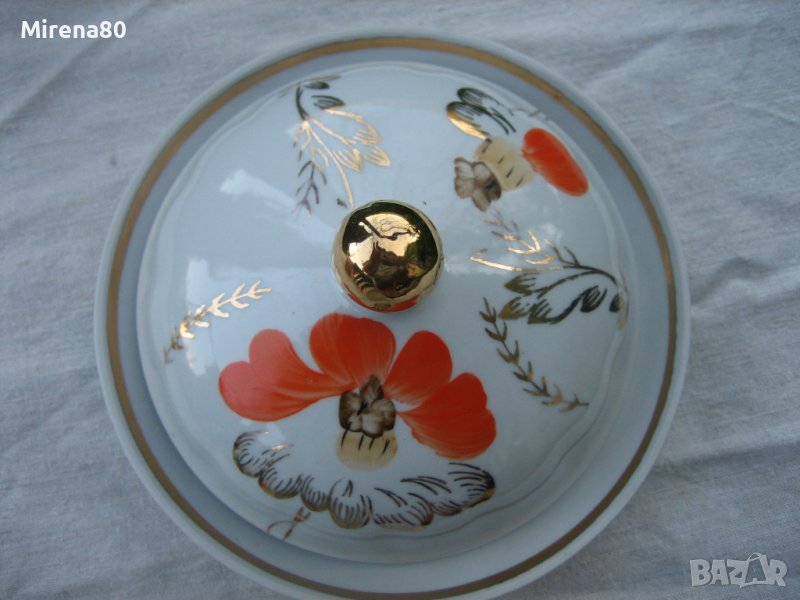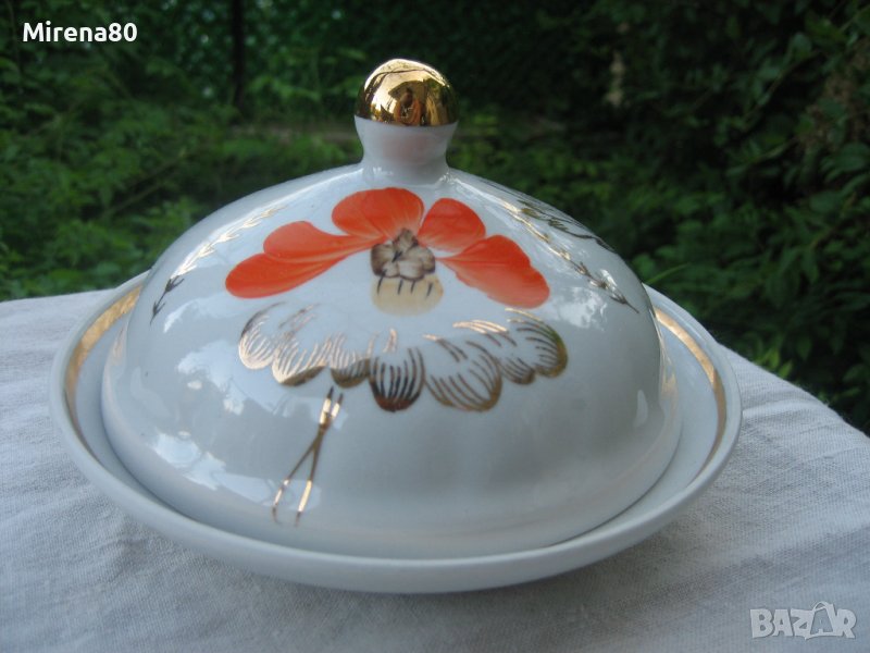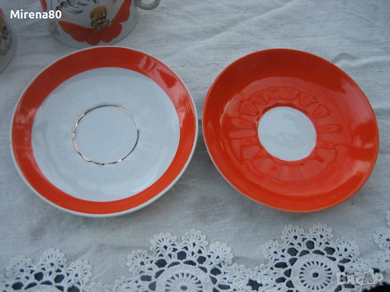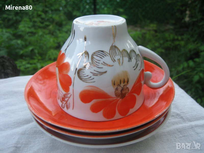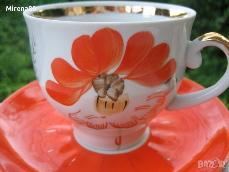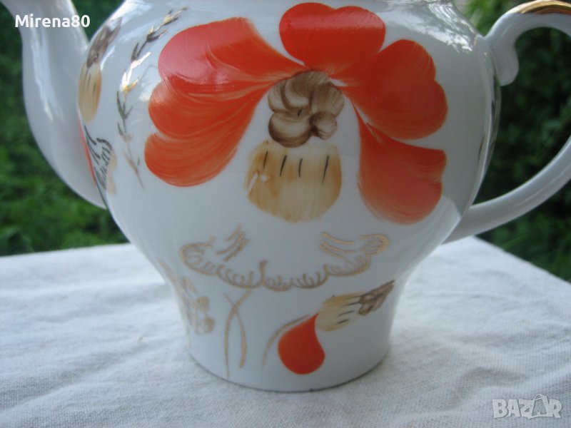 Барановский Фарфорен завод - от втората половина на миналия век. Пълен - 6 чаши с 6 чинийки, чайник с капак, захарница с капак и съд за сладки (или бисквити). Оранжев мак с много позлата, ръчна рисунка с 22 каратово злато. Рядък и много красив модел ! Маркировка за първо качество. Едната чинийка е леко по-различна от другите (но със сигурност си е оригинална към сервиза) и 2 други са с леко изтъркване на оранжевия цвят (снимани). Всичко друго е като ново !
