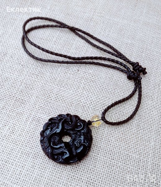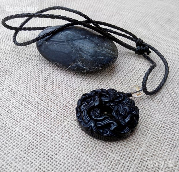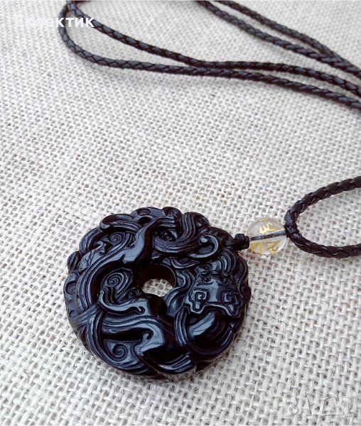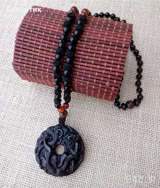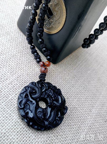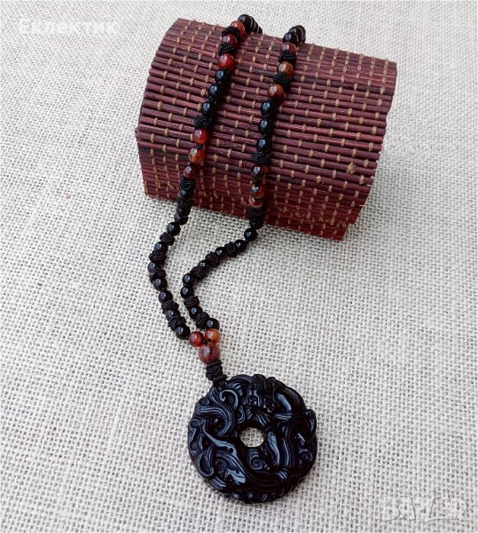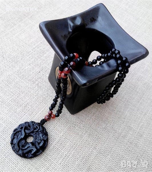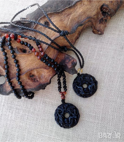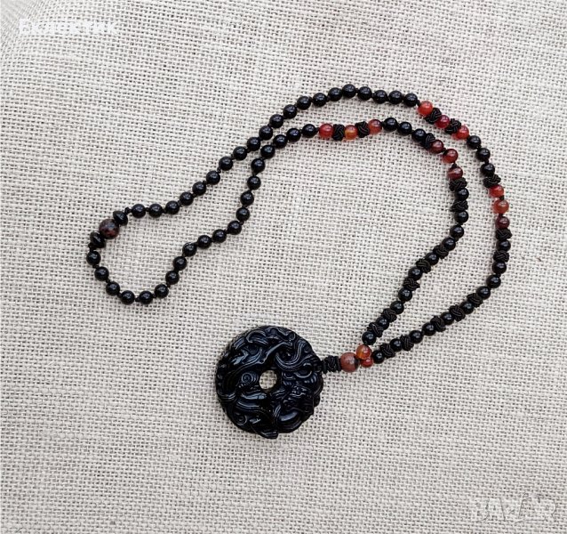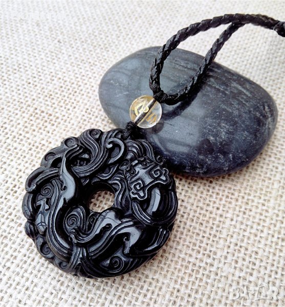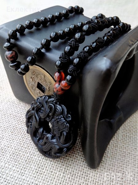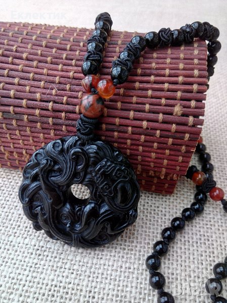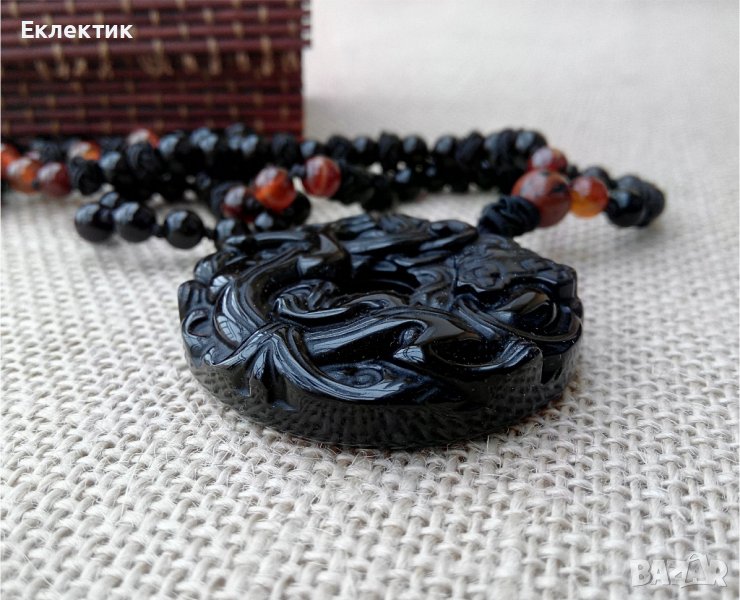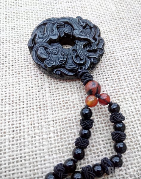 Легендарният дракон е популярен талисман във Фън Шуй, а също и амулет за късмет, дълголетие и радост, който предпазва от всякаква негативна енергия. Към мистичните сили на този символ се добавя енергията, носена от камъните: лечебните свойства на черния обсидиан, както и способността му да прочиства и заземява; черният ахат се осигурява защита, смелост и успех; карнеолът стимулира творческото начало, разсейва негативните енергии и ги заменя с положителни. Помага ви да намерите насоките в живота си и засилва чувството у вас, че контролирате живота си.