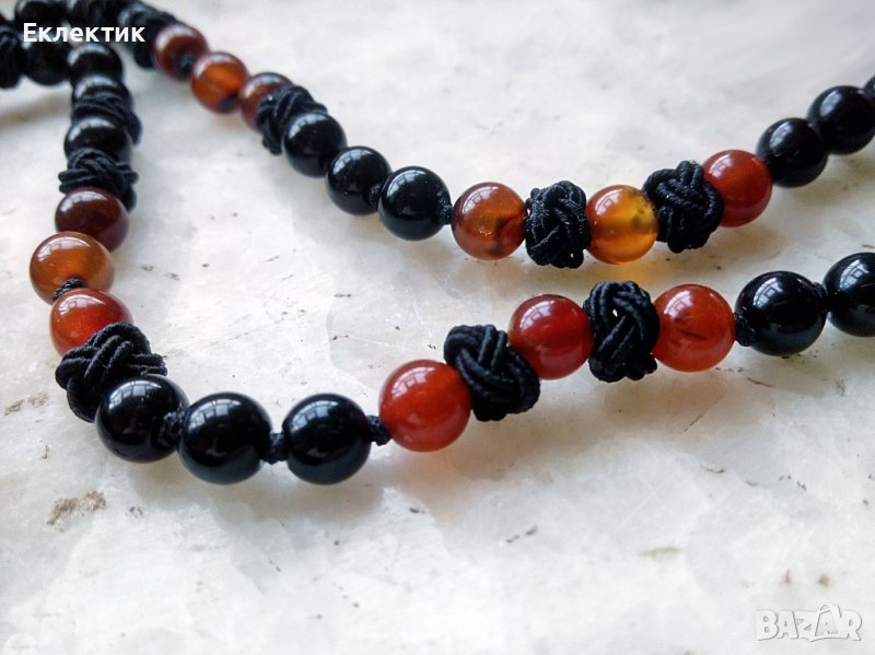 Другият ПРОДАДЕН е доста по-пищен. Представлява наниз със мъниста от различни полускъпоценни камъни, разделени с възли и с елементи от микро макраме. Мънистата са: черен ахат, карнеол, и махагонов обсидиан Герданът не е регулируем и е с дължина 65 см. Общата височина на висулката е 6,5 см, а цялото колие тежи 60 гр. (висулката тежи 32 гр.) Цена 58 лв.